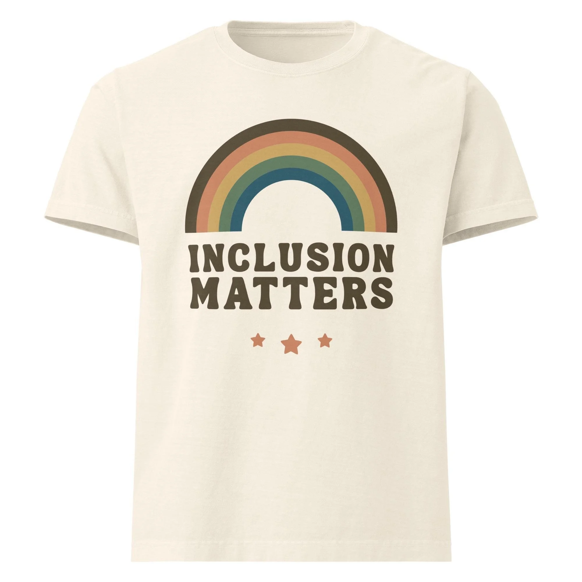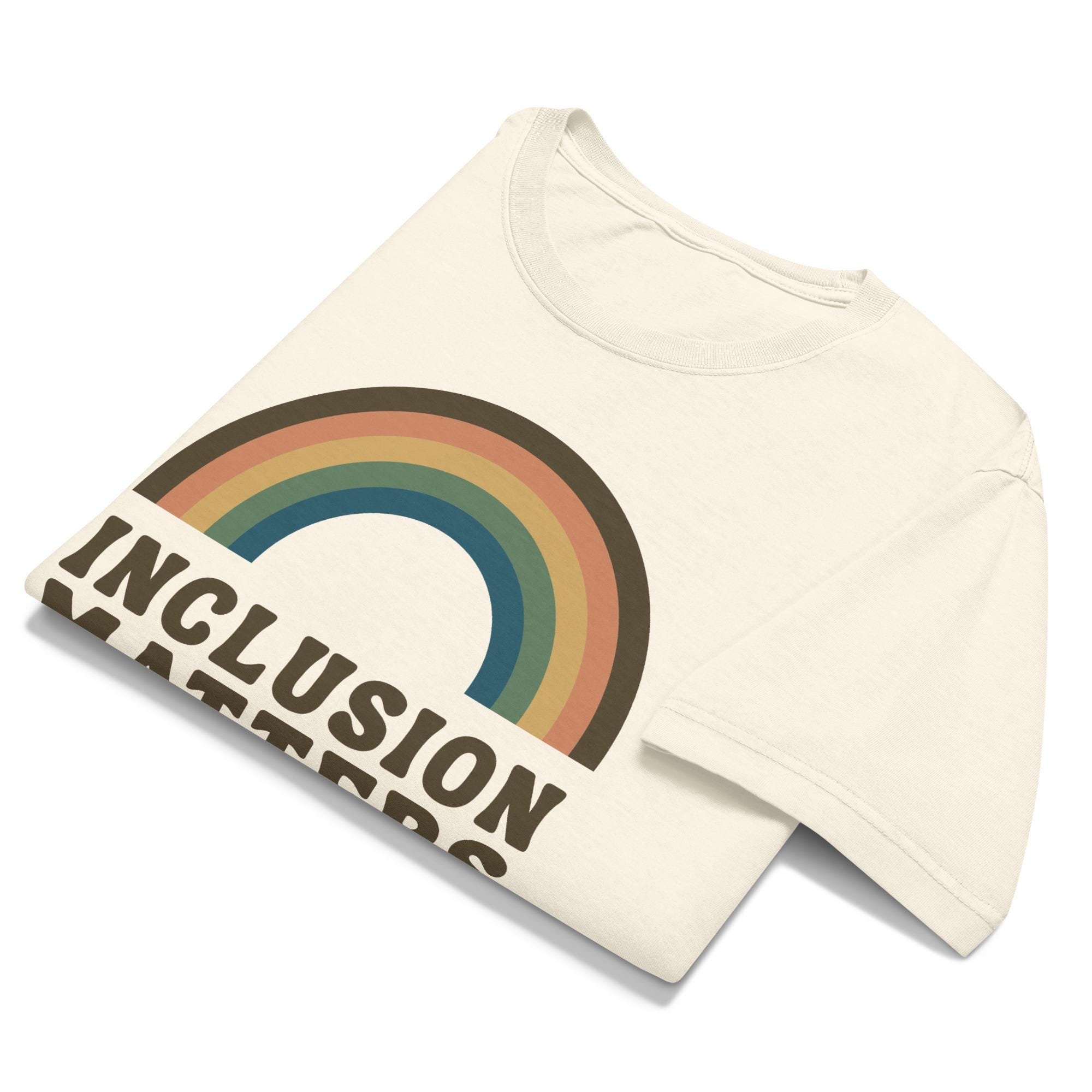 Bring a little retro charm to your everyday style with this Inclusion Matters vintage-inspired tee. The muted rainbow graphic and soft earthy tones give it that perfectly worn-in look, while the heavyweight cotton adds structure without sacrificing comfort. Designed with an oversized fit, this shirt pairs effortlessly with jeans, leggings, or layered under your favorite jacket for an elevated streetwear vibe that still feels cozy and intentional.